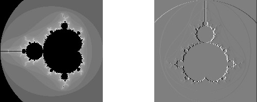 gray8s_image_t img(dims); x_gradient(rotated90cw_view(mandel), view(img)); // Save the Mandelbrot set and its 90-degree rotated gradient (jpeg cannot save signed char; must convert to unsigned char) jpeg_write_view("mandel.jpg",mandel); jpeg_write_view("mandel_grad.jpg",color_converted_view<gray8_pixel_t>(const_view(img))); Here is what the two files look like: